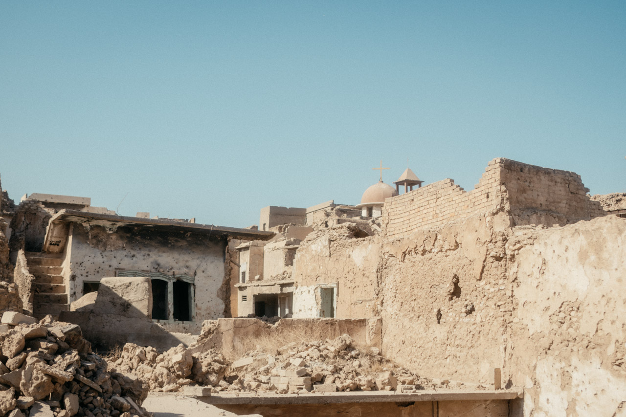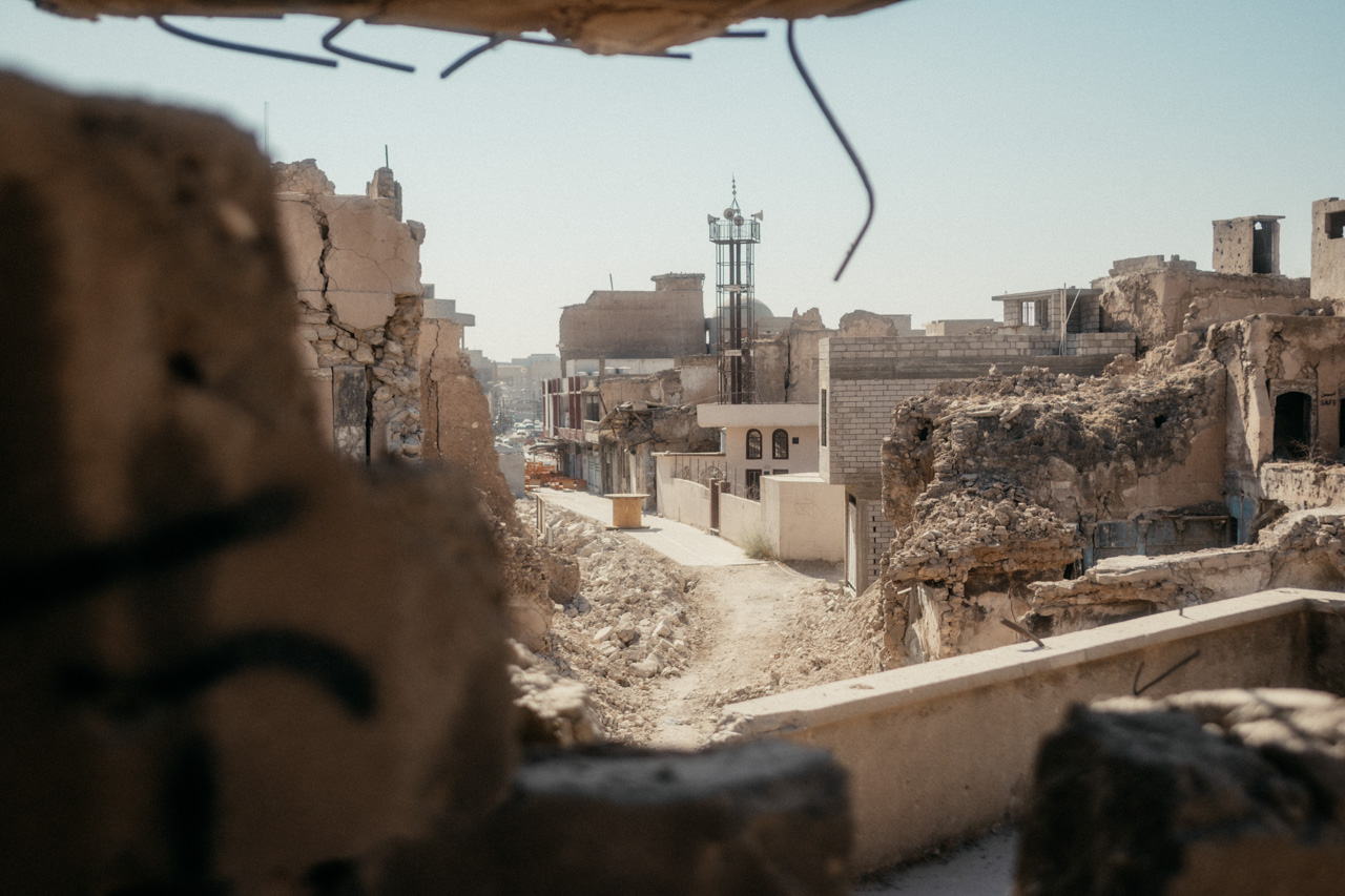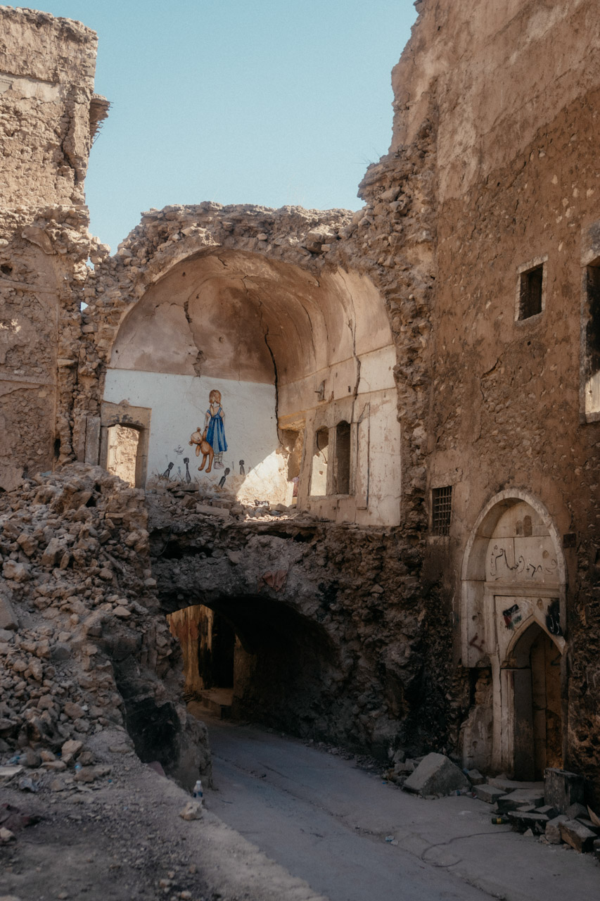 Wenige Meter weiter, die riesigen Trümmerhaufen der Altstadt. An ein paar Stellen wird langsam aufgebaut, auf vielen der Häuser findet sich der Schriftzug „Safe“. Das bedeutet, diese Häuser wurden auf Minen und Blindgänger gecheckt und sind theoretisch begehbar, abgesehen natürlich von der Gebäudesubstanz. Wir laufen durch die Trümmer und können es uns kaum vorstellen. Hier hatte sich der IS verschanzt und die Bewohner als lebendiges Schutzschild benutzt.