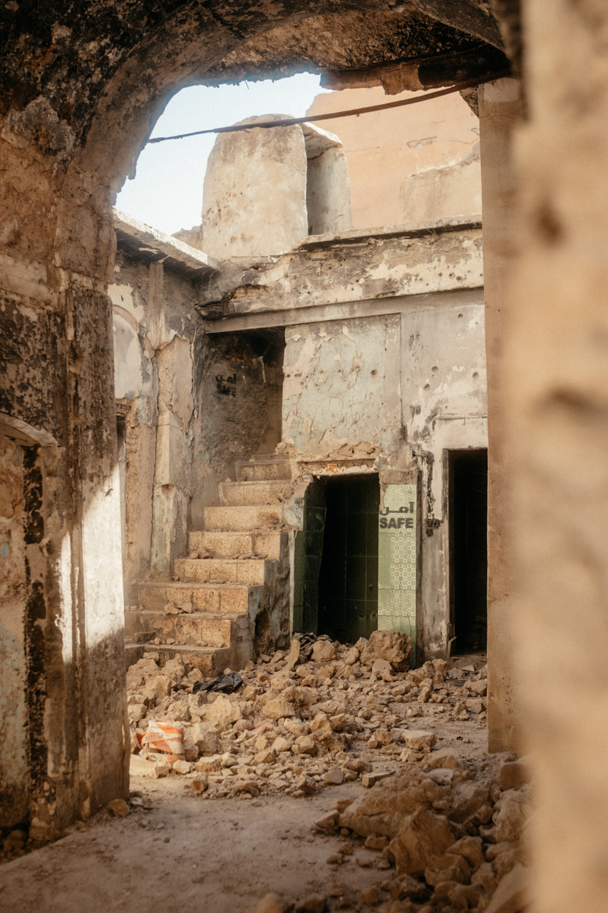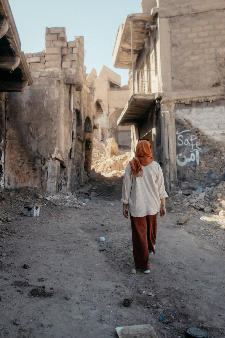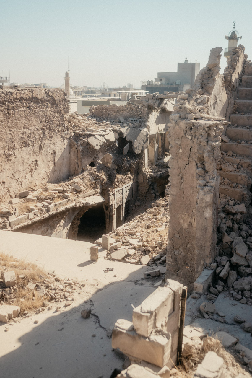 Wenige Meter weiter, die riesigen Trümmerhaufen der Altstadt. An ein paar Stellen wird langsam aufgebaut, auf vielen der Häuser findet sich der Schriftzug „Safe“. Das bedeutet, diese Häuser wurden auf Minen und Blindgänger gecheckt und sind theoretisch begehbar, abgesehen natürlich von der Gebäudesubstanz. Wir laufen durch die Trümmer und können es uns kaum vorstellen. Hier hatte sich der IS verschanzt und die Bewohner als lebendiges Schutzschild benutzt.