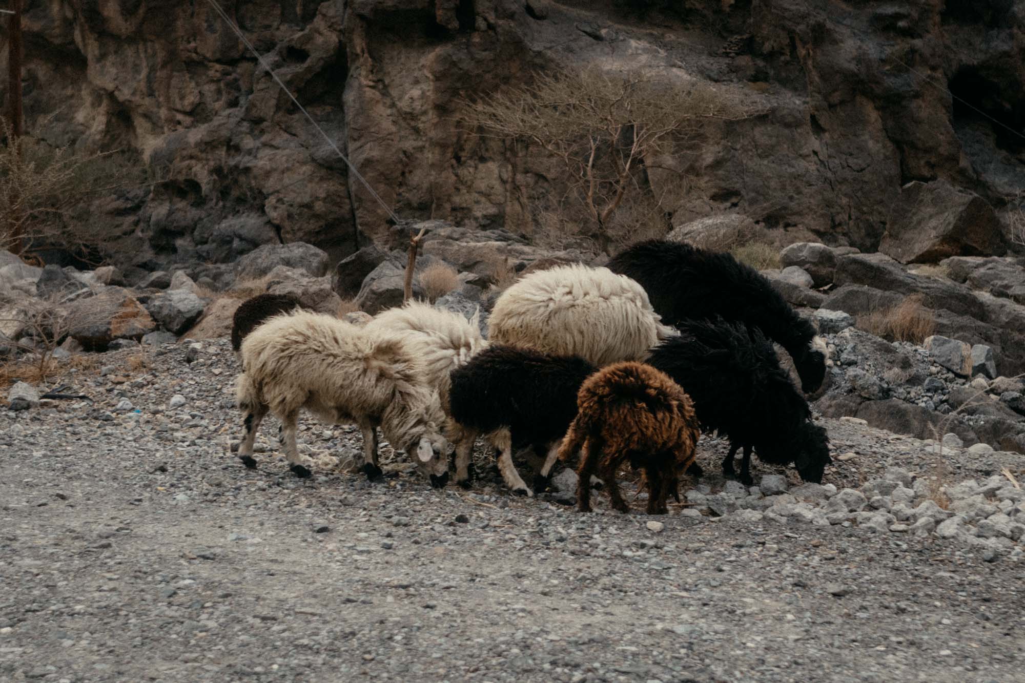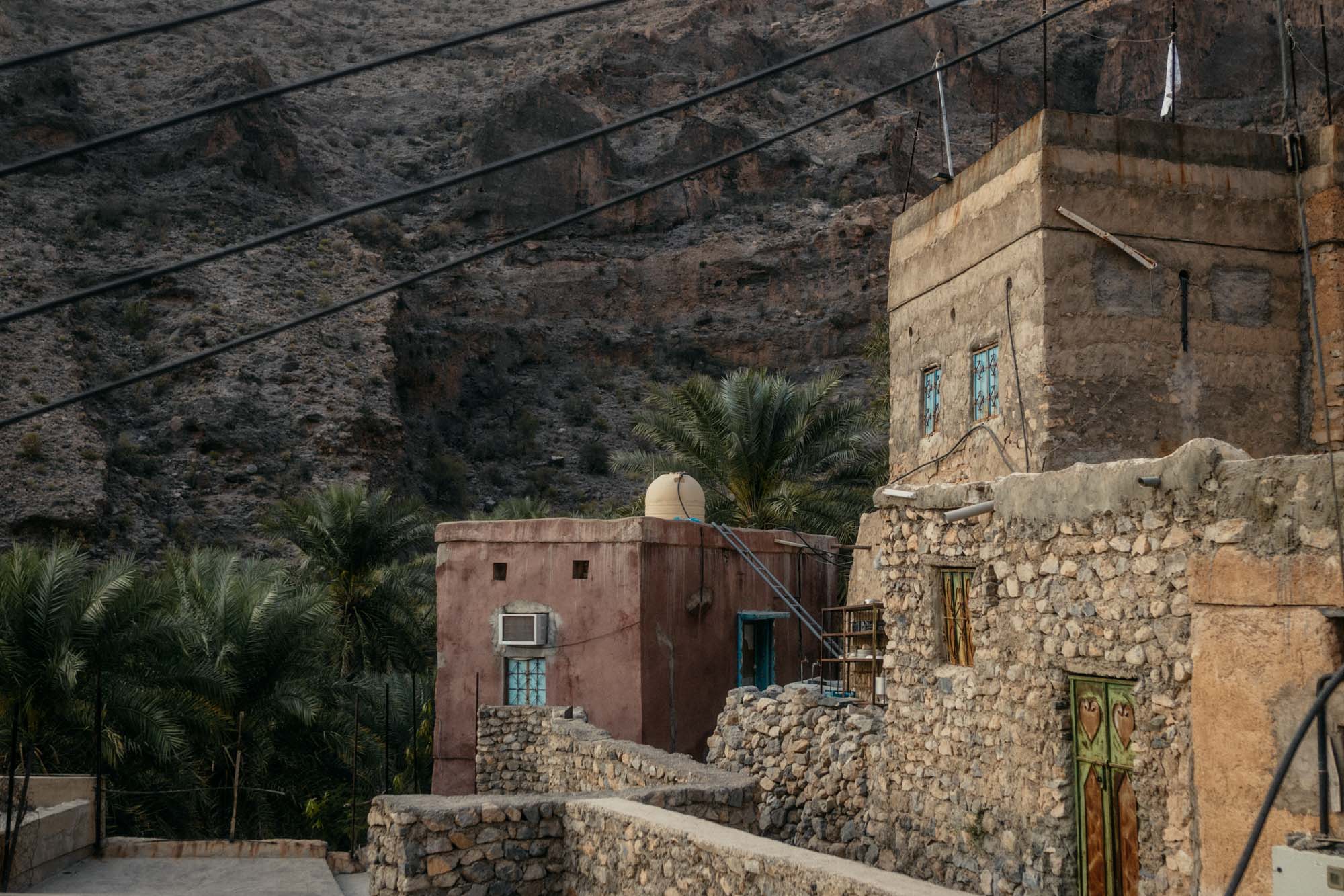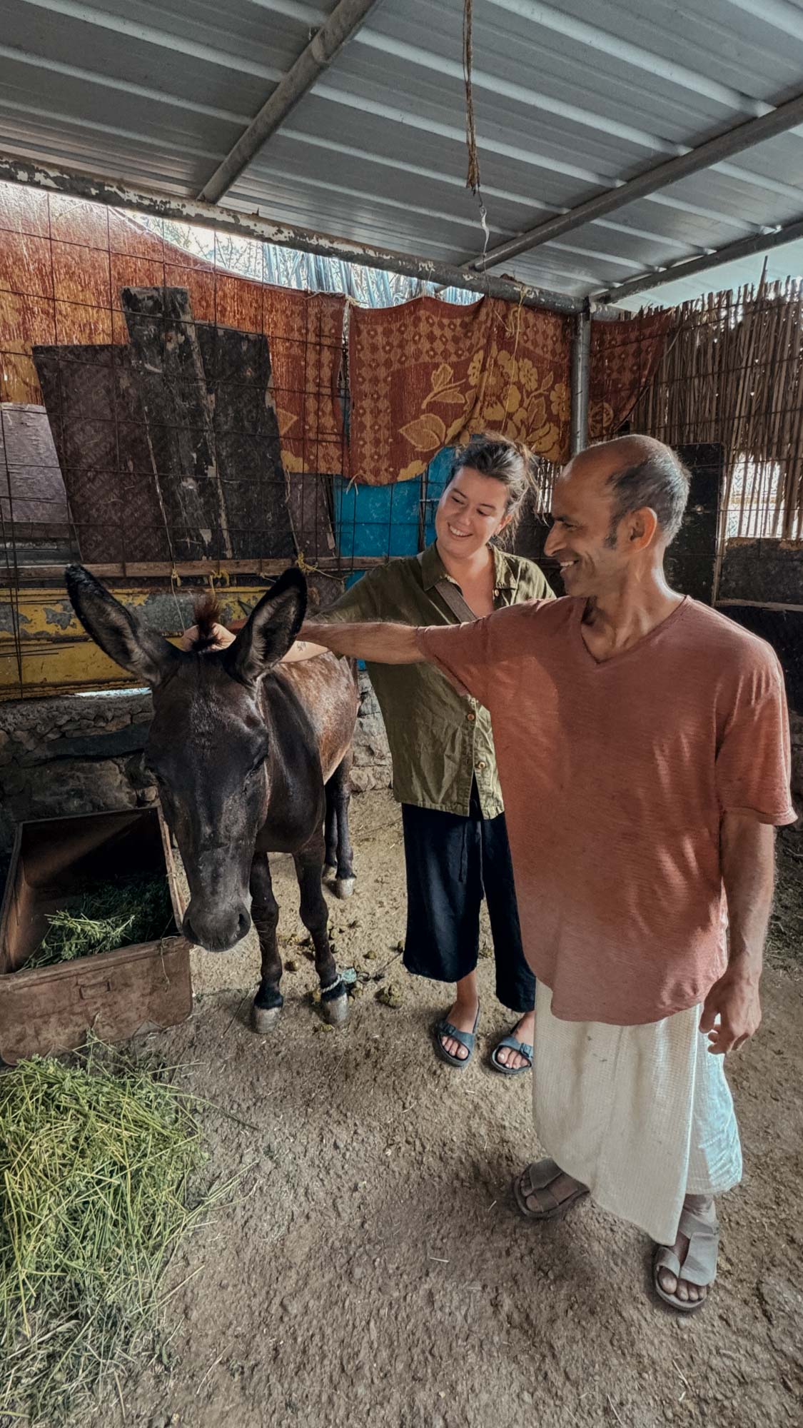 Auf dem Weg zu seinem Esel kommen wir an einem weiteren My House vorbei, aus dem es laut miaut. Wir blicken ihn fragend an und er sagt, da drin lebe seine Katze, die sperrt er als ein, wenn er unterwegs ist, damit sie ihm nicht wegläuft. Besser trifft es den Esel. Er heißt Sahin und man merkt die Wertschätzung und Zuneigung zu diesem wichtigen Arbeitskollegen und Weggefährten. Anders wie andere Esel im der Oman darf Sahin in einem richtigen und sauberen Stall wohnen, es gibt Schatten, Grünfutter und Datteln, Wasser und Streicheleinheiten von seinem Besitzer.