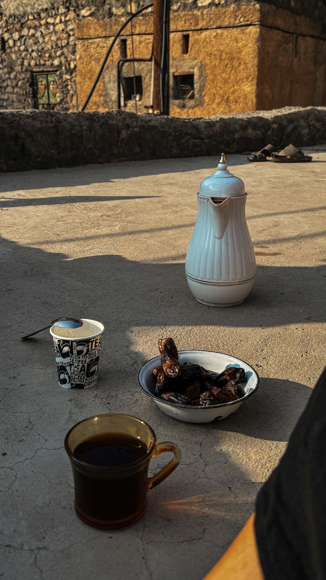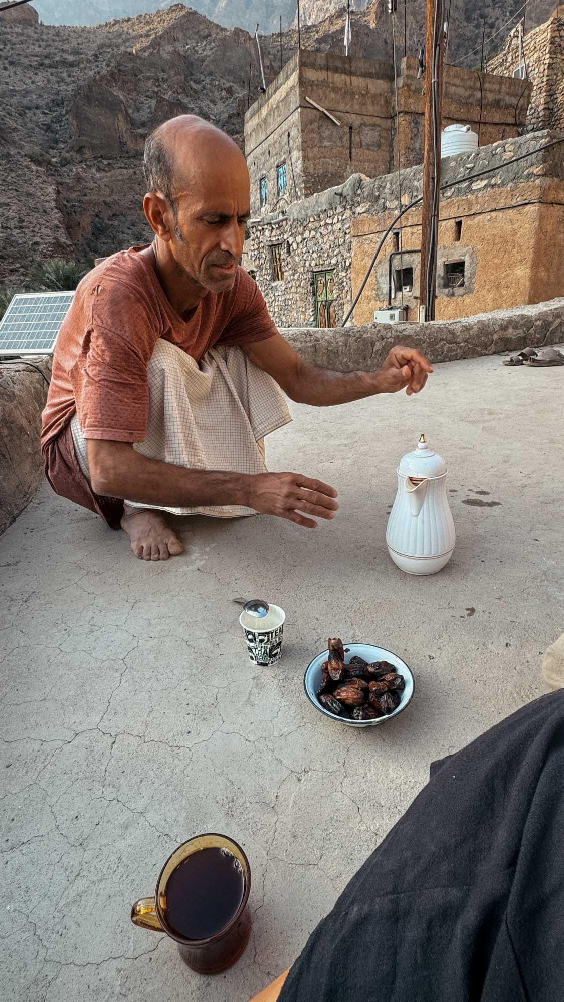 Auf dem Weg zurück setzt er uns auf einem Hausdach ab und befiehlt uns: here rest. Er fragt uns, ob wir Omani Kaffee oder Tee möchten, wir sind unsicher, denn es ist eigentlich Ramadan, aber er lässt nicht locker und kocht uns eine Kanne Tee und schenkt uns eine Schale voll mit seinen Datteln.